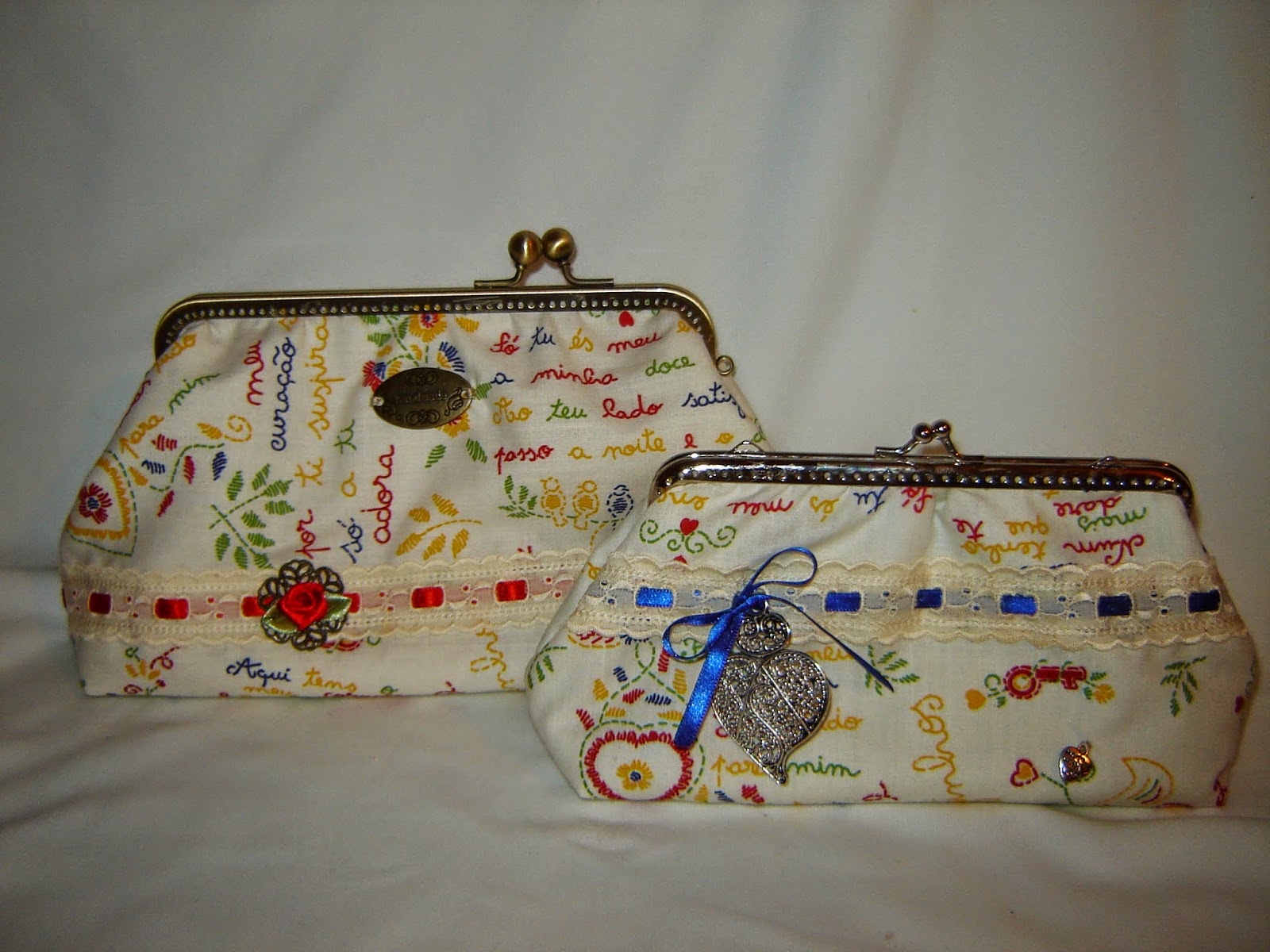 Conjunto necessaire e porta moedas com aplicação de flor e fitas